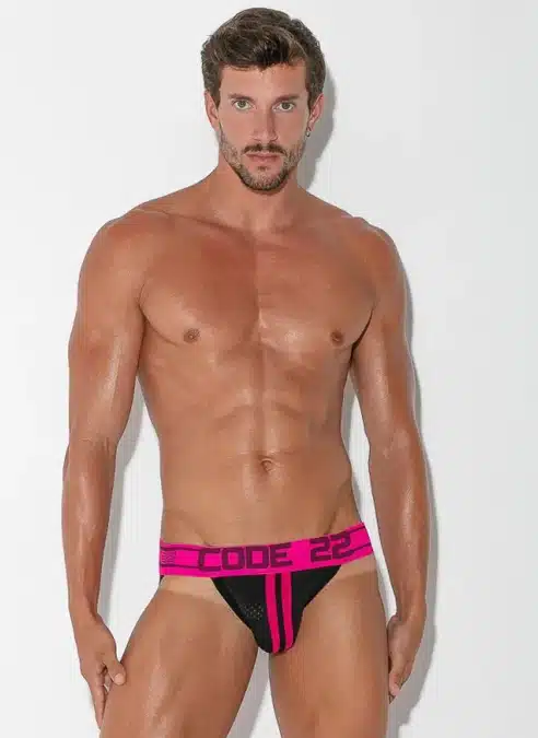 Low cut jockstrap made of the finest sport mesh fabric. Push-up pouch and Super soft elastic waistband with contrast front stripes.