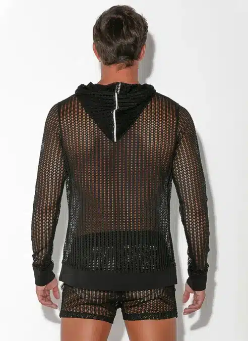 Hoody made of the finest openwork jacquard fabric. Contrast piping details on hood, sleeve, and pocket. Ribbed finishing on sleeves and waist.