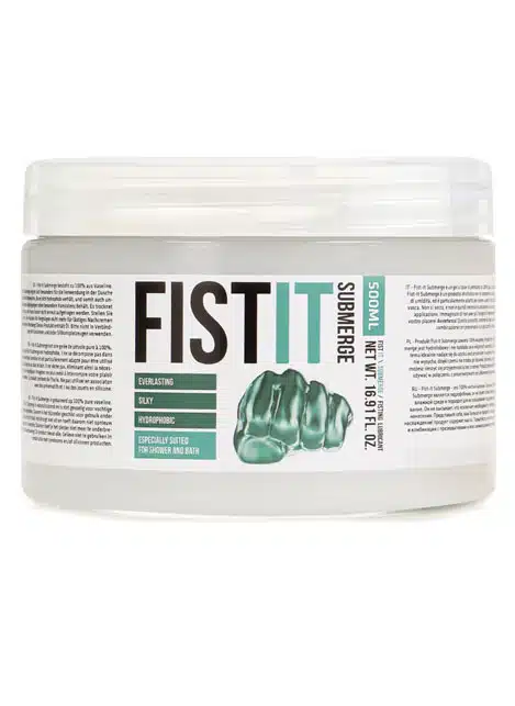 Fist It Submerge is a 100% pure petroleum jelly. Because Fist-It Submerge is hydrophobic it does not break down in moist conditions and is especially suited to use under the shower or in the bath. It does not dry out, eliminating the need to reapply. Imagine no longer needing to interrupt your pleasure!