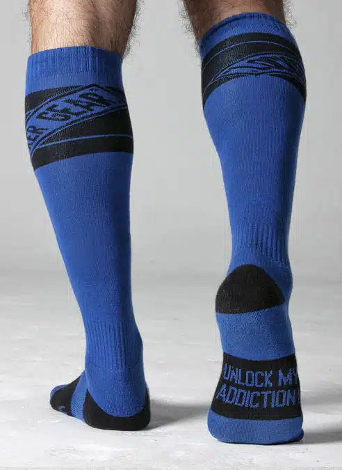 Knee high fetish socks in the classic Locker Gear colors. With contrast details, padlock and ‘Unlock my addiction’ logo on the foot.