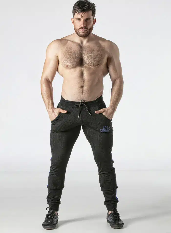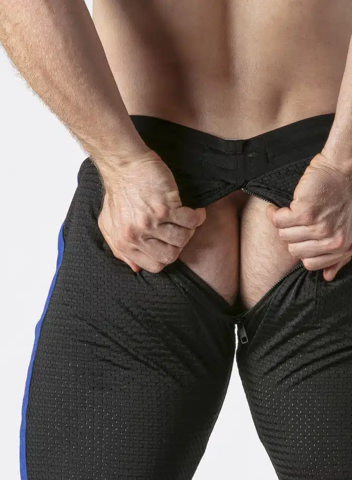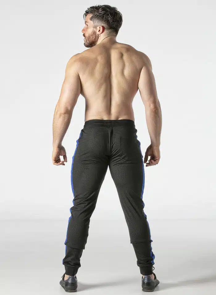 Jogger with hidden back zipper for easy access to that ass. Made of the finest breathable mesh fabric with ribbed finishing on waist and bottom and contrasting pinhole side bands. It has two front pockets and one back pocket for all your party essentials.