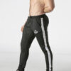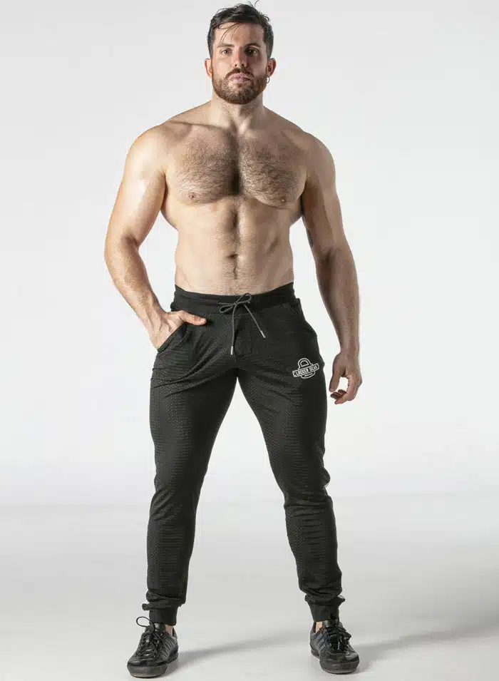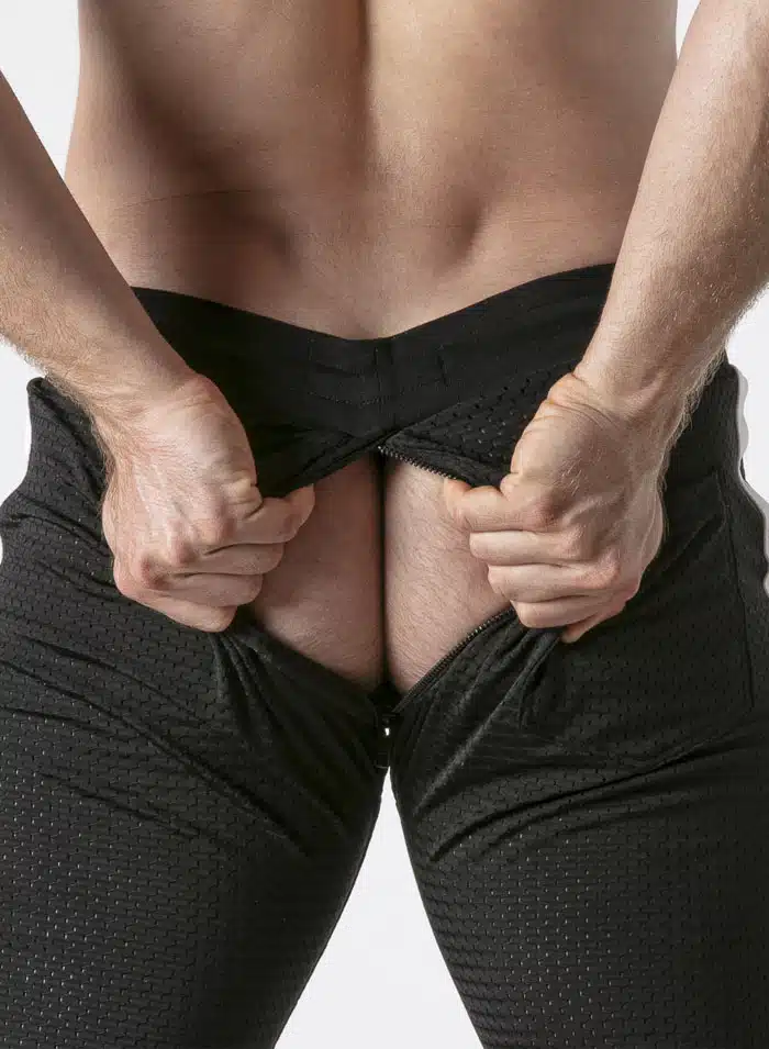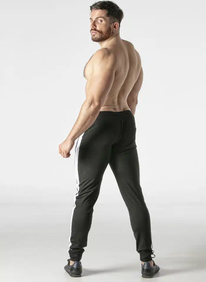 Jogger with hidden back zipper for easy access to that ass. Made of the finest breathable mesh fabric with ribbed finishing on waist and bottom and contrasting pinhole side bands. It has two front pockets and one back pocket for all your party essentials.