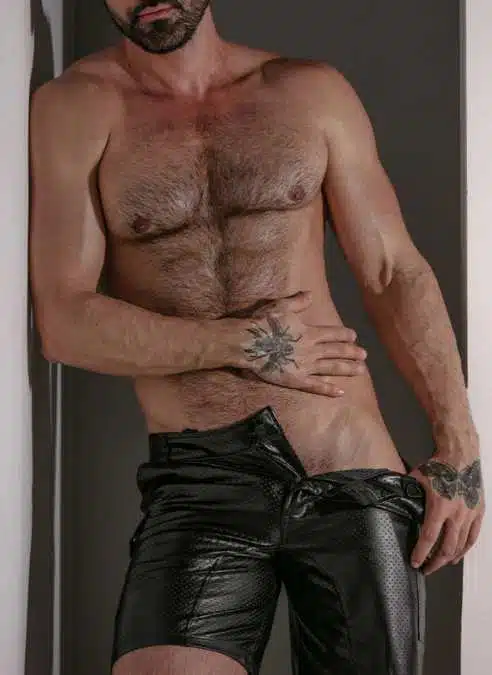 Loose Fit cargo short made of the finest perforated leatherette fabric with hidden back zipper opening. Functional zip on front fly, D-rings inside the waistband to attach your body harness and leatherette details on waist and saddle.