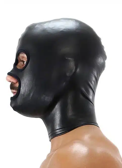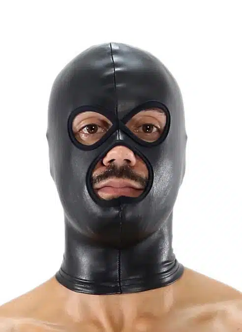Imitation leather SM hood with 3 openings. A top ideal for games of submission and domination.