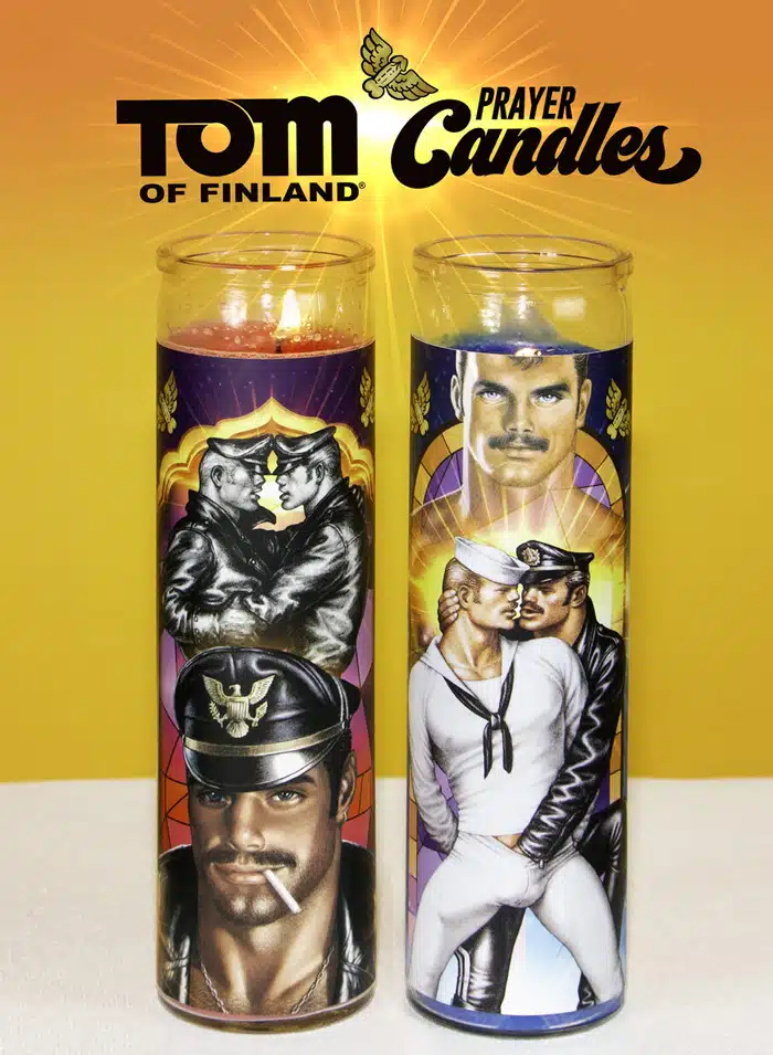 Our Saint Slutty Sailor candle features fellas from two of Tom’s most popular color illustrations: the embracing, leather-clad cop & studly sailor — while above, in the heavens, stands a perfect shirtless god, looking down upon his creation.