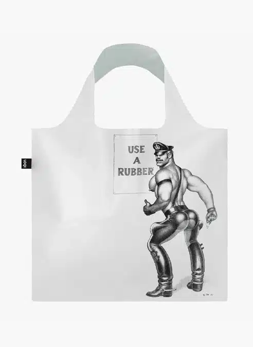 Tom of Finland, a cult illustrator. By day he crafted campaigns of happy heterosexual couples buying soft drinks and laundry detergent for advertising. By night, he was otherwise occupied. Bulging muscles. Throbbing members. Motorcycles. Gay pride. Any time a stylist puts a young pop star in a leather biker cap for a magazine shoot, the impact of Tom of Finland is not far-off. The iconic artwork is depicted on the milky transparent bag.