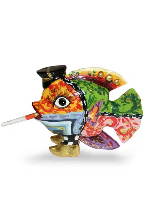 Fish “Sammy” is a real Tom’s drag. With his fantastic costume full of exotic, playful ornaments, he is adorned like a carnival parade. What a wonderful world! He only smokes now and then: the small cigarette is removable.
